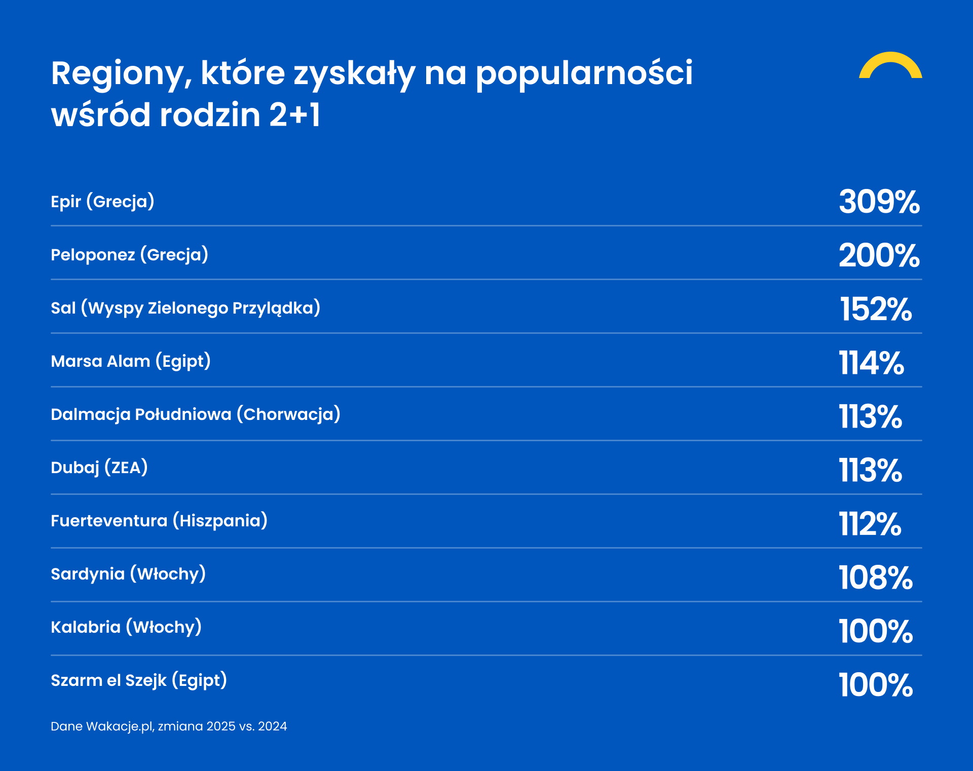 Jeśli zejdziemy stopień niżej i spojrzymy na najchętniej wybierane przez Polaków wakacyjne regiony, na czele listy wyłoni nam się turecka Antalia. Za nią plasują się Hurghada, Marsa Alam i Szarm el Szejk w Egipcie oraz Heraklion we wschodniej części Krety. I choć każda z tych destynacji – wraz z rosnącą popularnością wyjazdów z biurami podróży – notuje wzrost rok do roku, to dopiero spojrzenie nieco głębiej, na rosnące tempo zainteresowania poszczególnymi regionami, odsłania tegoroczne gwiazdy wakacji, czyli miejsca, które wybrało dwa razy więcej turystów niż rok temu. To imponujący wzrost nawet o ponad 100 procent